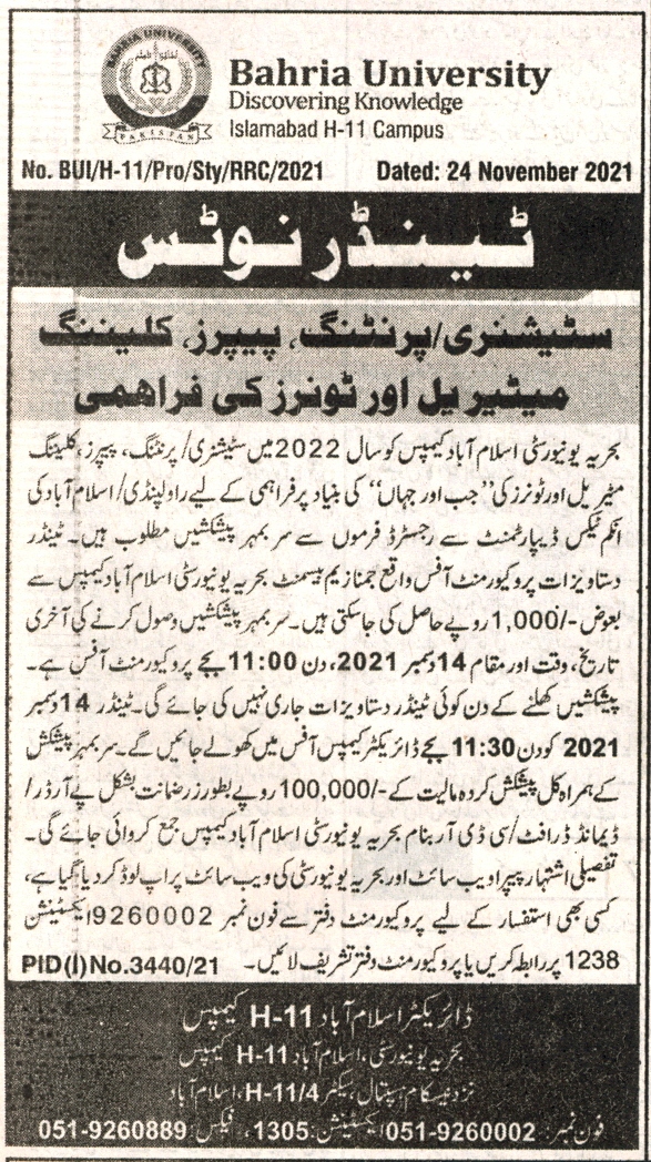Stationery, Printing Papers, Cleaning Material and Toners for Bahria University Islamabad for Calendar Year 2022