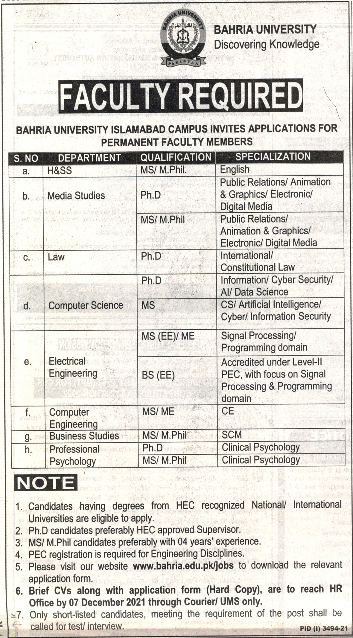 Faculty Required (HSS, Media Studies, Law, Computer Science, Electrical Engineering, Computer Engineering, Business Studies and Professional Psychology)