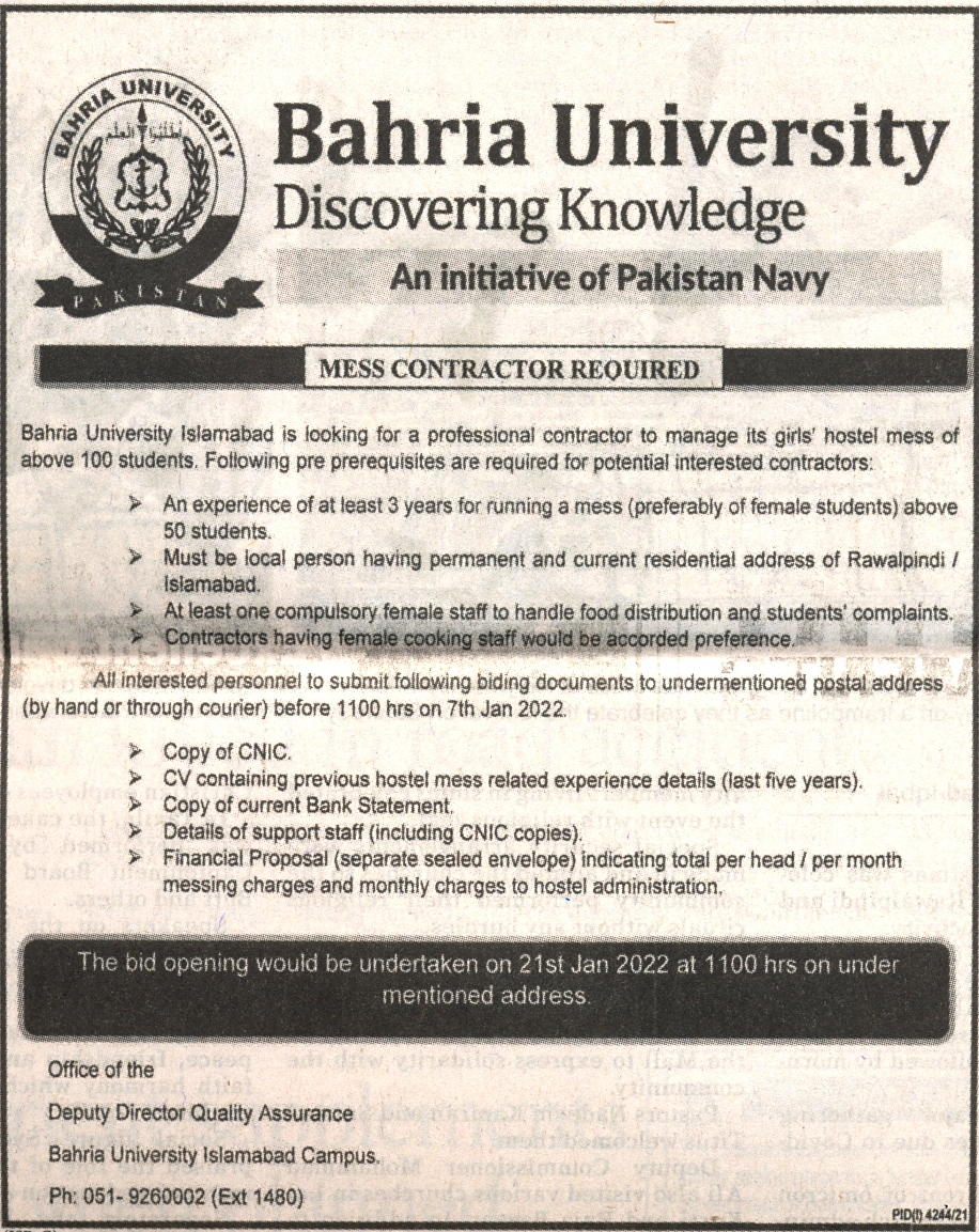 Mess Contractor Required of BUIC Girl's Hostel