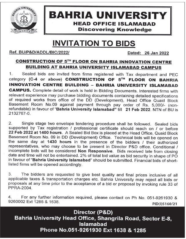 Construction of 5th Floor on Bahria Innovation Center Building at Bahria University Islamabad Campus