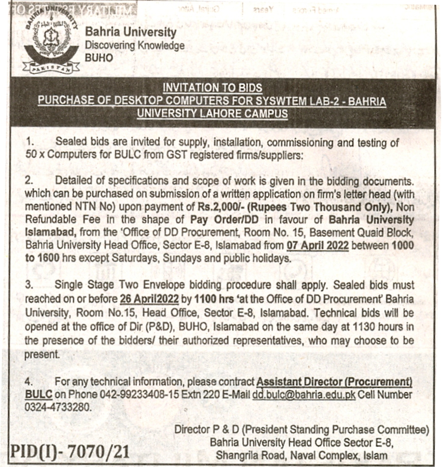 Invitation to Bids Purchase of Desktop Computers for Syswtem LAB-2 Bahria University Lahore Campus