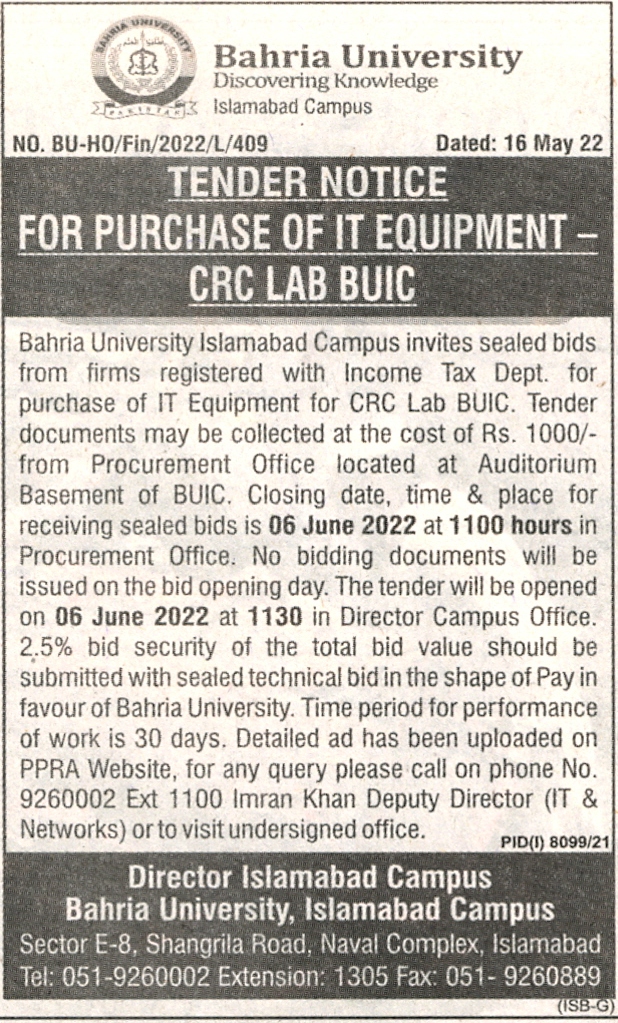 Procurement of IT Equipment for Bahria University Islamabad Campus CRC Lab