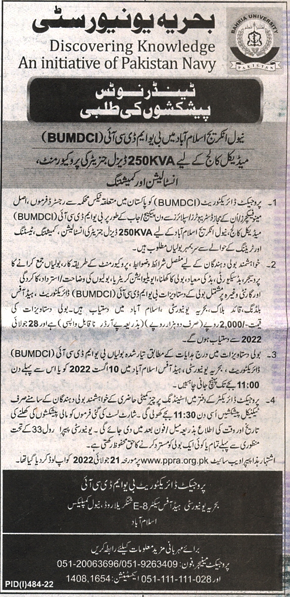 Procurement. Installation and Commissioning of 250 KVA Diesel Generator for BUMDCI Medical College at Naval Anchorage Islamabad