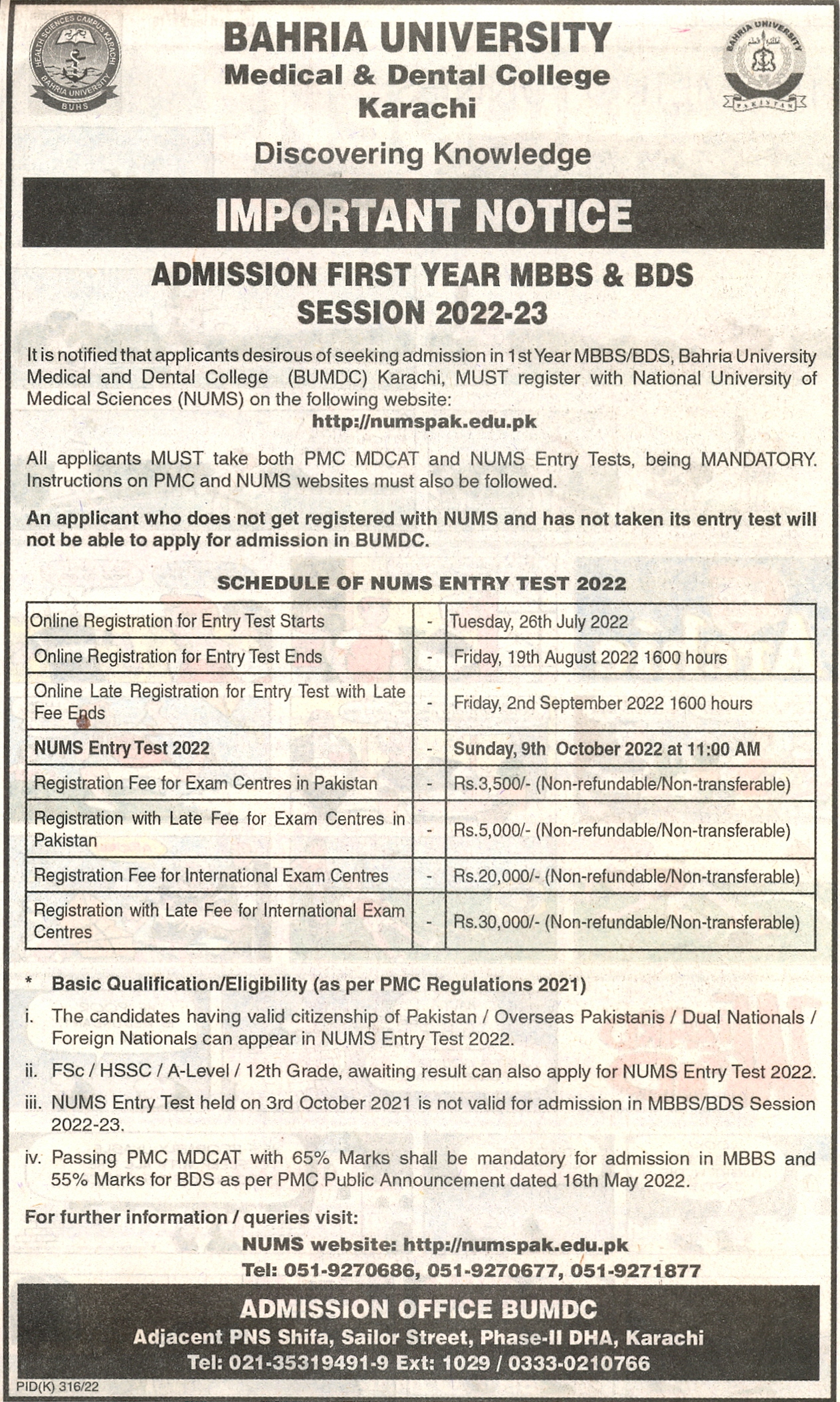 Admission First Year MBBS & BDS Session 2022-23