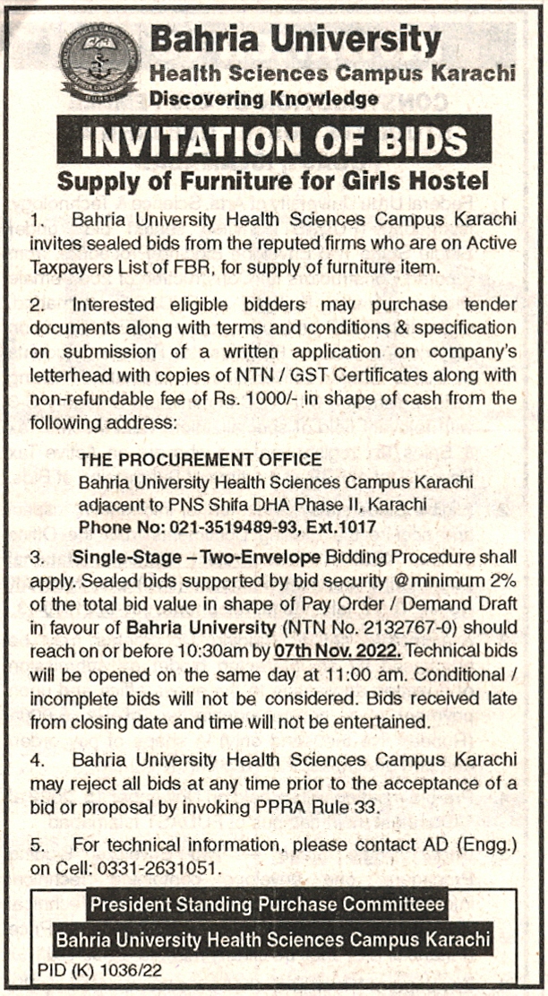 Supply of Furniture for Girls Hostel Bahria University Health Sciences Campus Karachi
