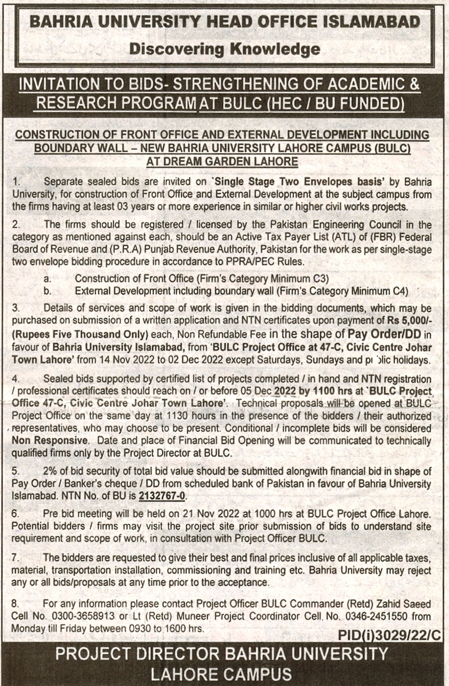 Invitation to Bids-Strengthening of Academic & Research Program at BULC (HEC / BU Funded)