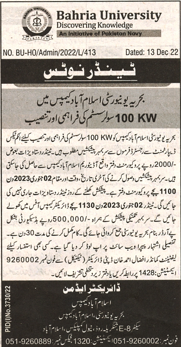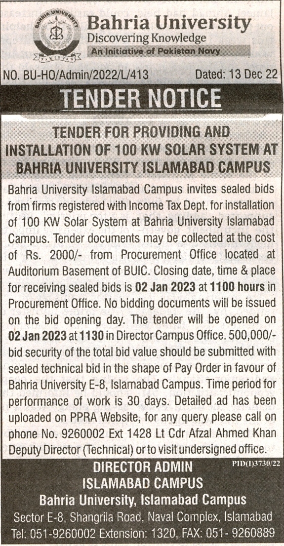 Providing and Installation of 100 KW Solar System at Bahria University Islamabad Campus