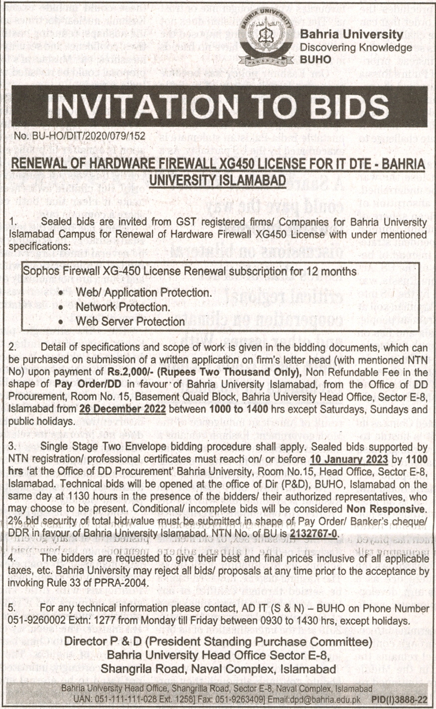 Renewal of Hardware Firewall XG450 License for IT DET - Bahria University Islamabad