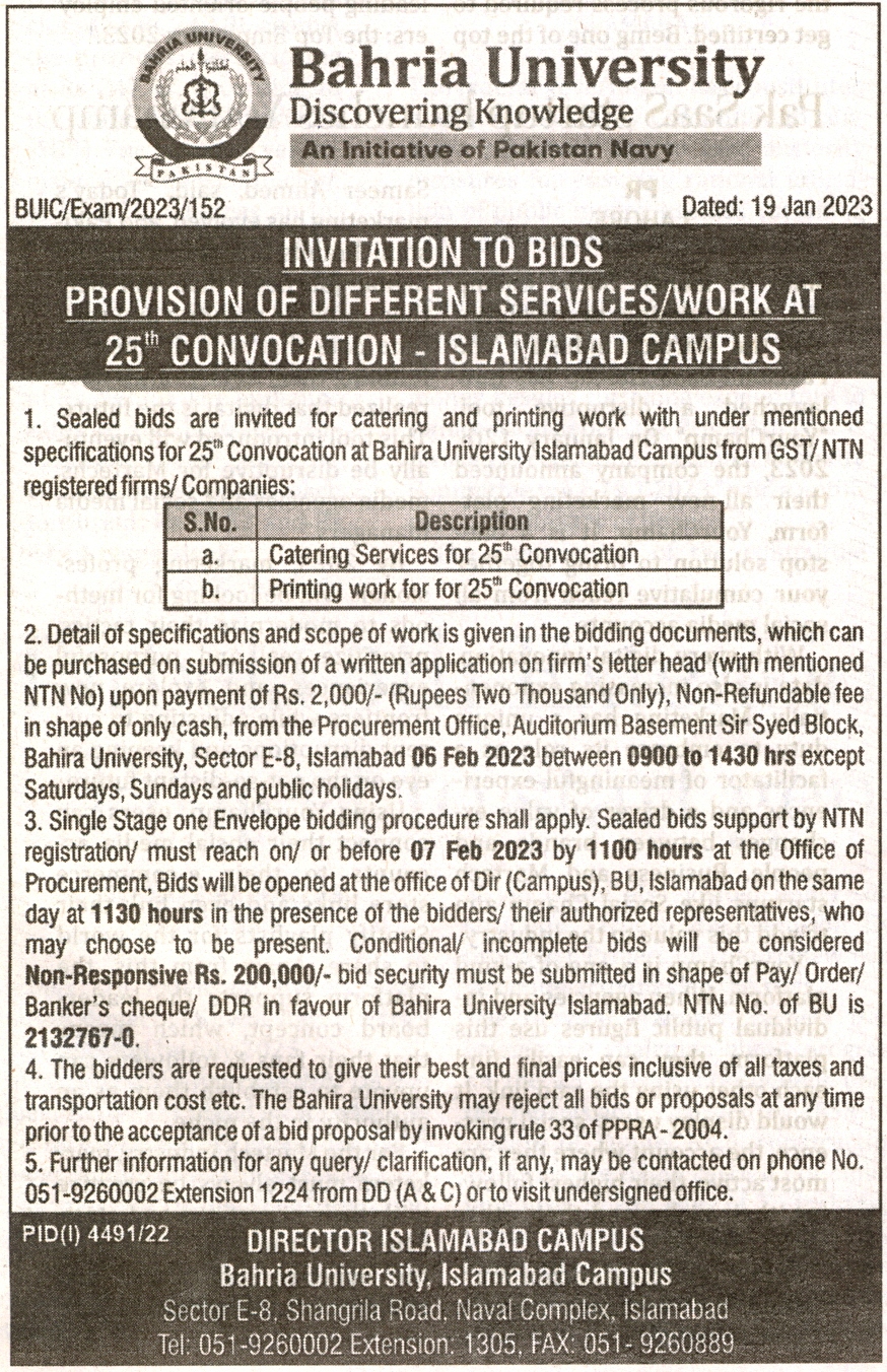 Invitation to Bids- Provision of Different Services/Work at 25th Convocation- Islamabad Campus