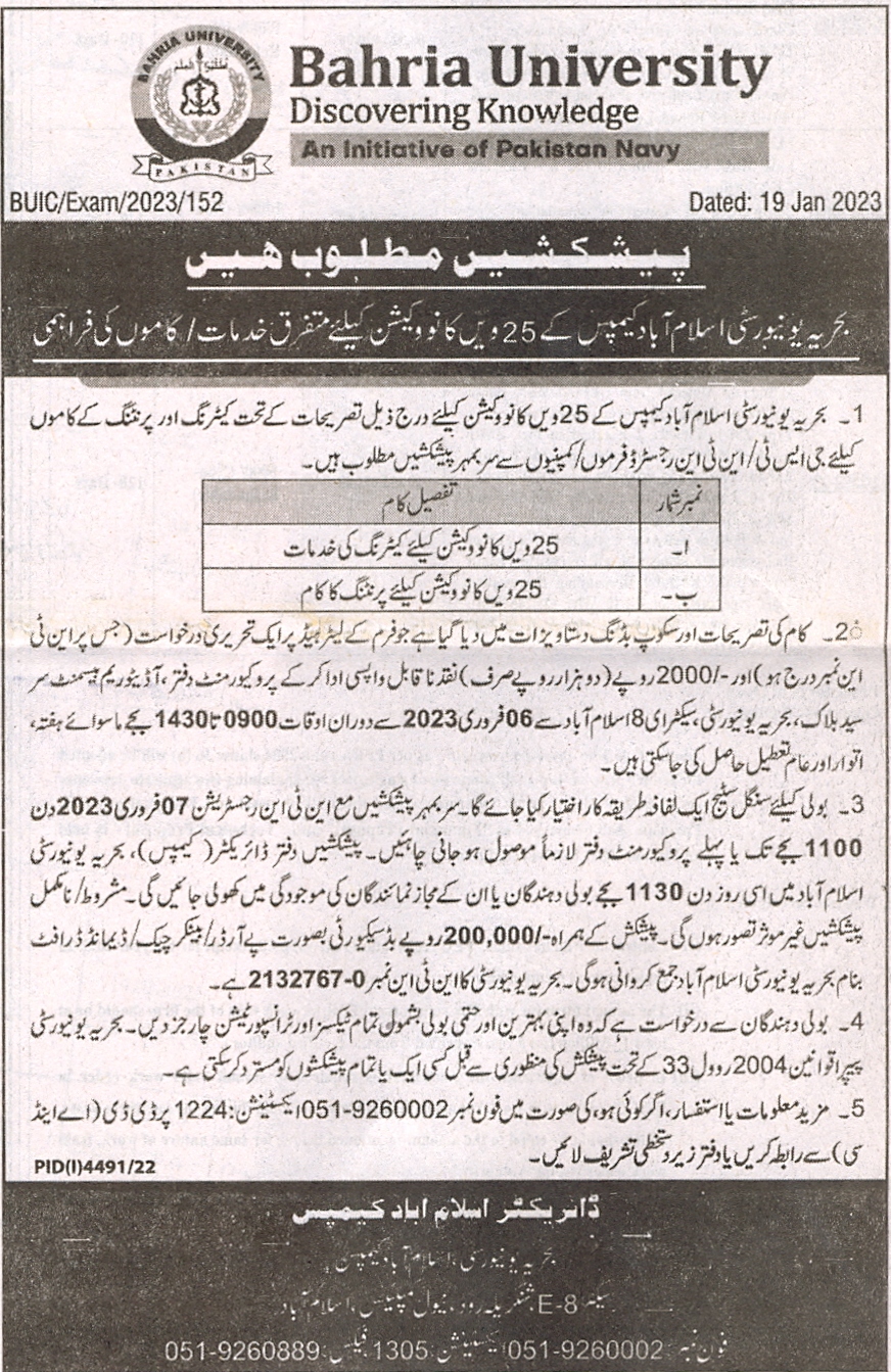 Invitation to Bids- Provision of Different Services/Work at 25th Convocation of Bahira University Islamabad Campus