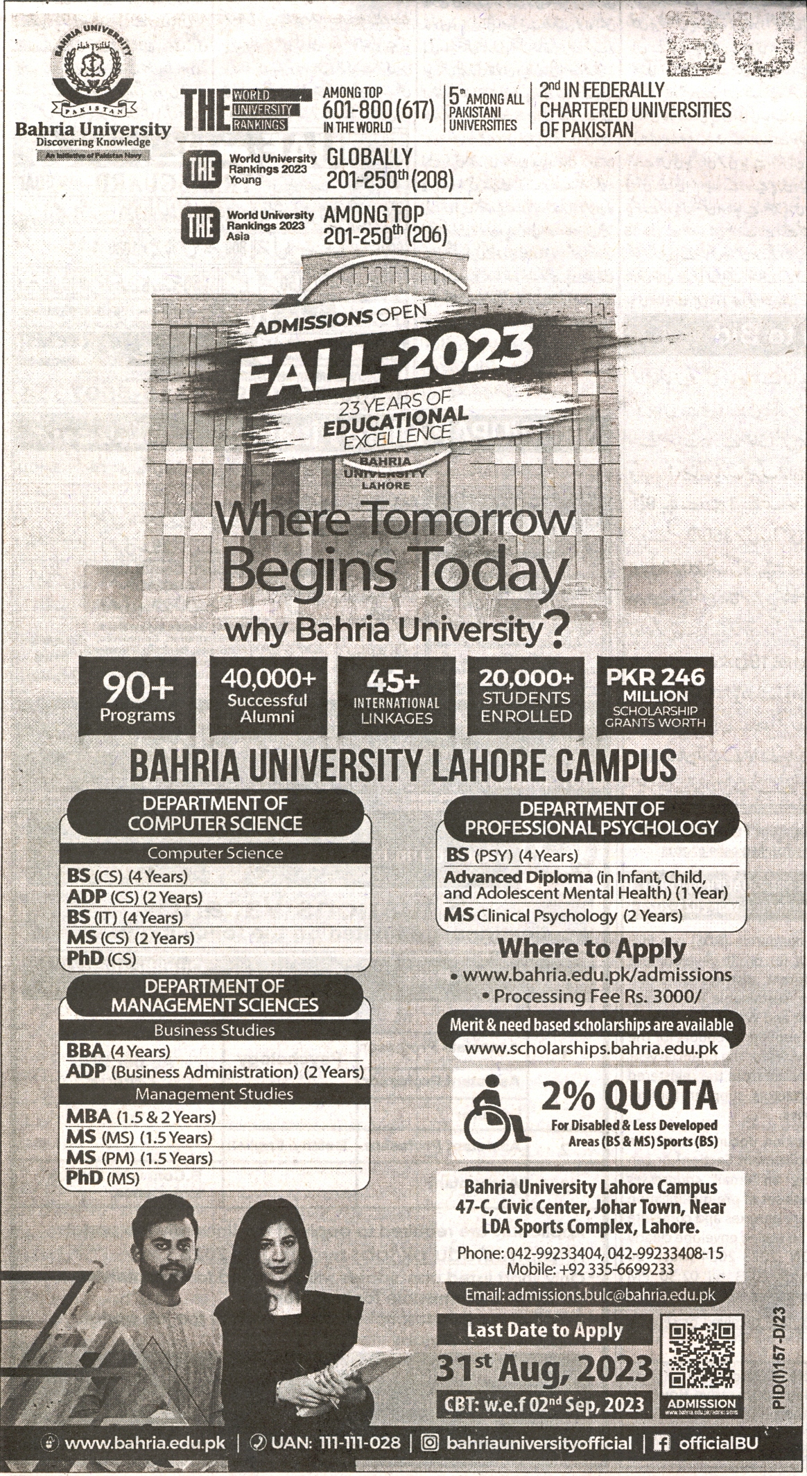 Admission Open Fall-2023, Bahria University Lahore Campus