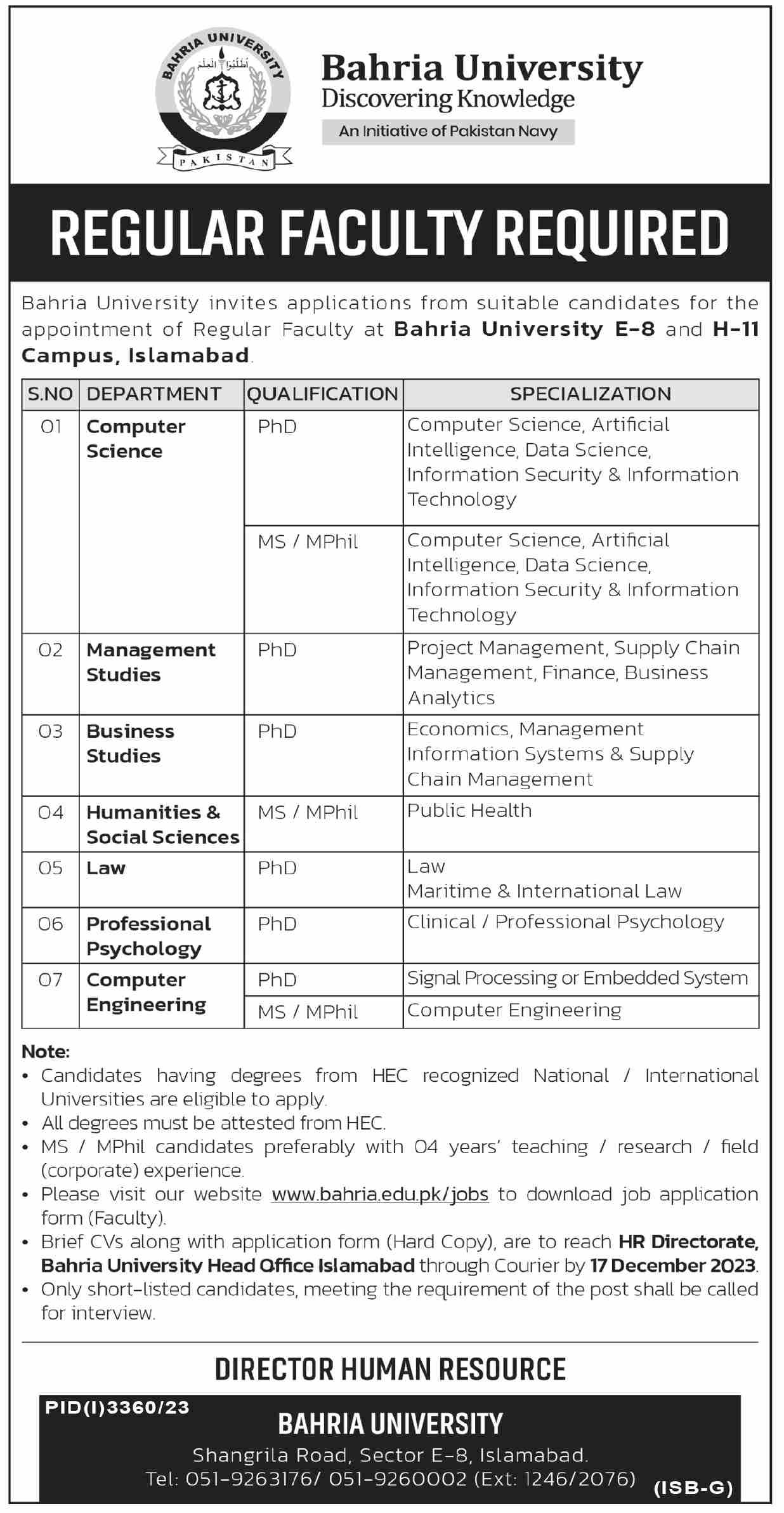 Regular Faculty Required at Bahria University E-8 and H-11 Campus, Islamabad
