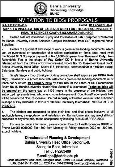 Supply & Installation of Lab Equipment for The Bahria University Health Sciences Islamabad (BUHSCI)