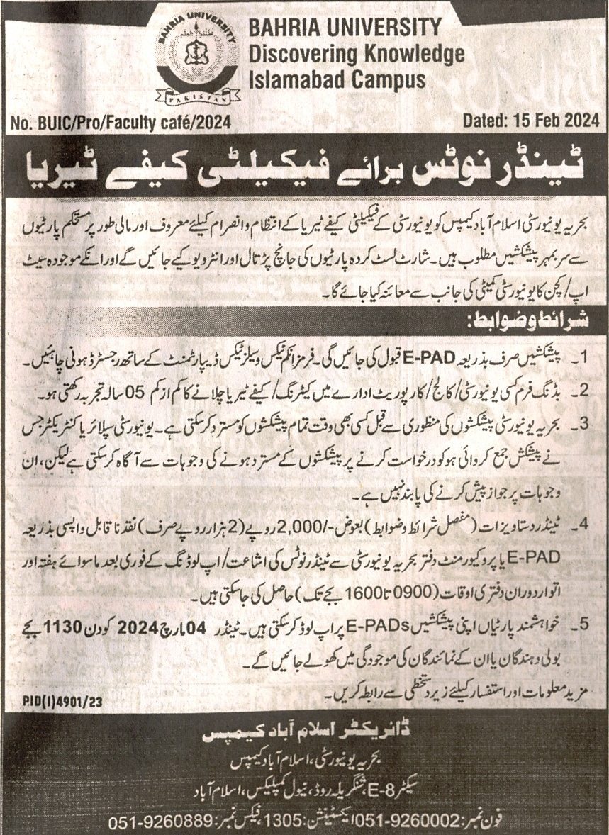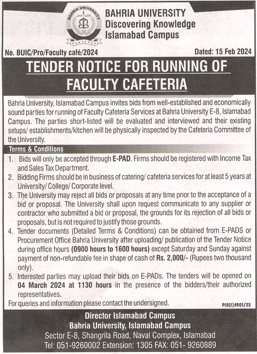 Tender Notice for Running of Faculty Cafeteria