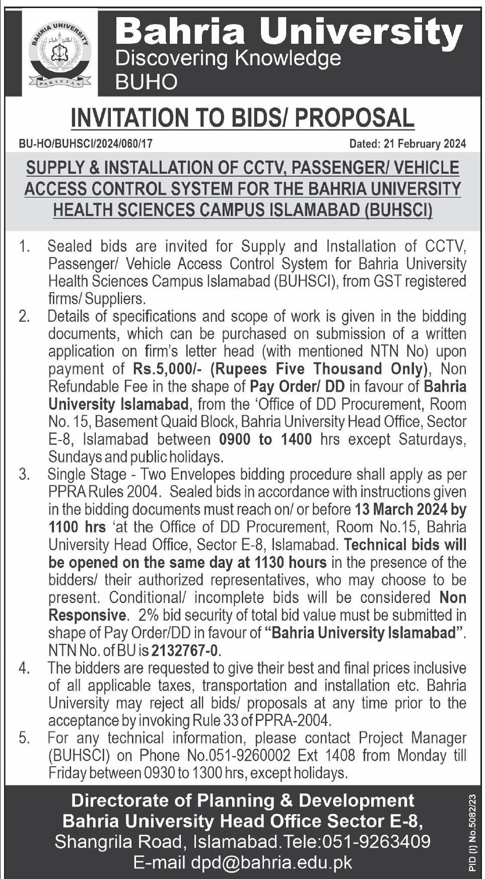 Supply & Installation of CCTV, Passenger/Vehicle Access Control System for the Bahria University Health Sciences Campus Islamabad (BUHSCI)