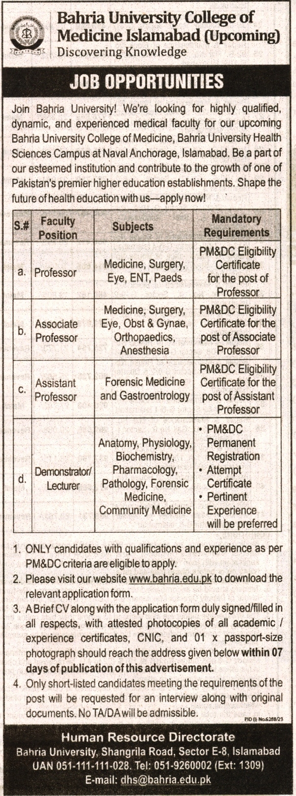 Job Opportunities in Bahria University Collage of Medicine Islamabad