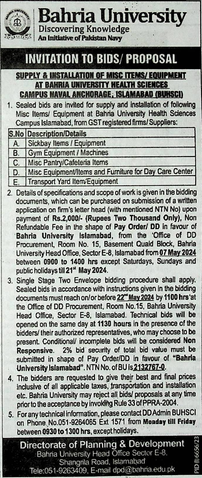 Supply & Installation of Misc Items/Equipment at Bahria University Health Sciences Campus Naval Anchorage, Islamabad (BUHSCI)