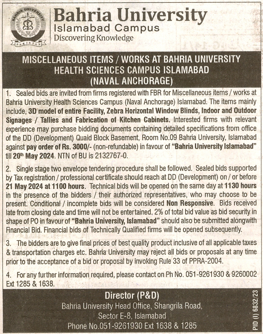 Miscellaneous Items / Works at Bahria University Health Sciences Campus Islamabad (Naval Anchorage)