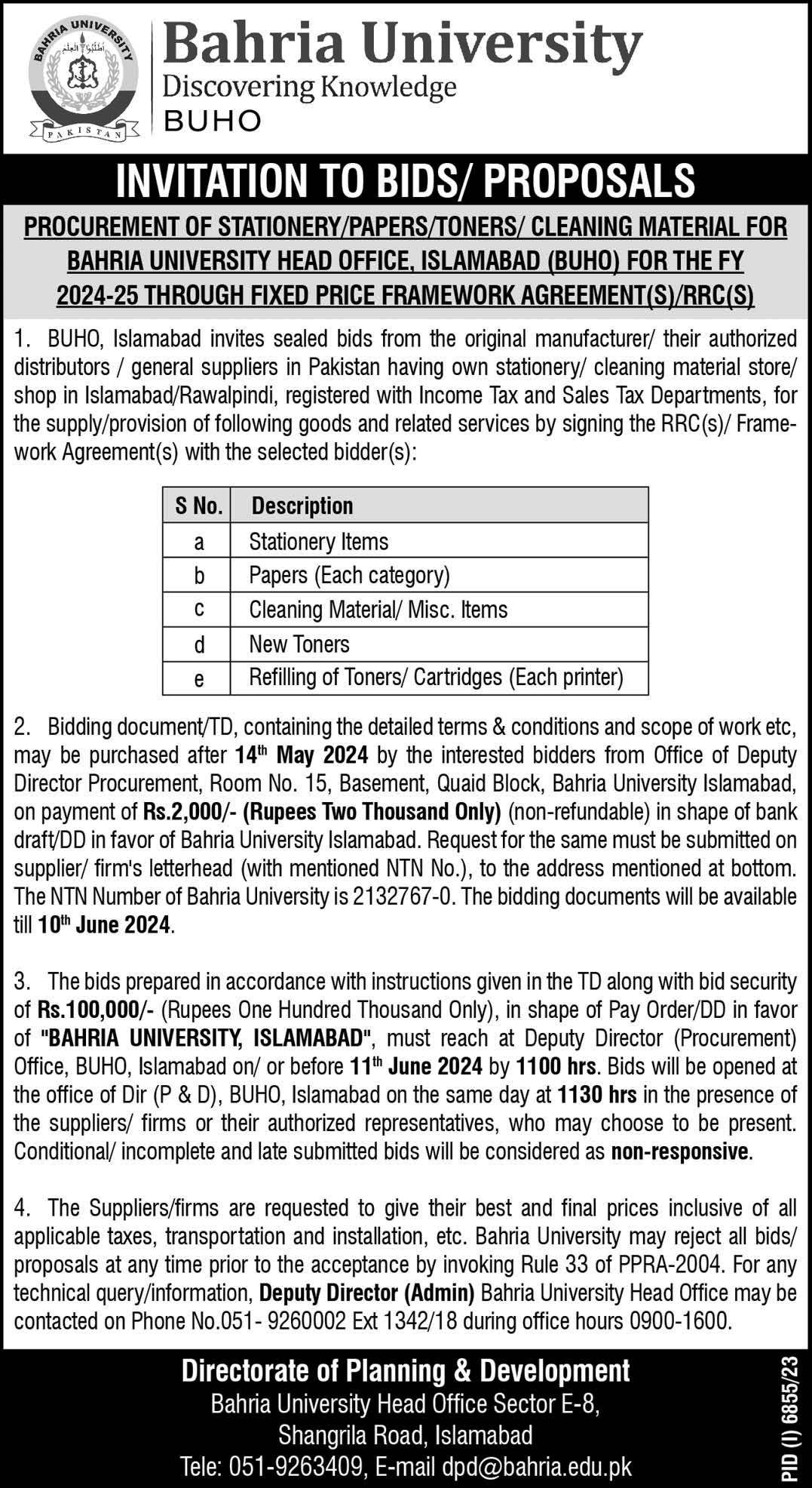 Procurement of Stationery/Papers/Toners/Cleaning Material for Bahria University Head Office (BUHO) Islamabad for The FY 2024-25