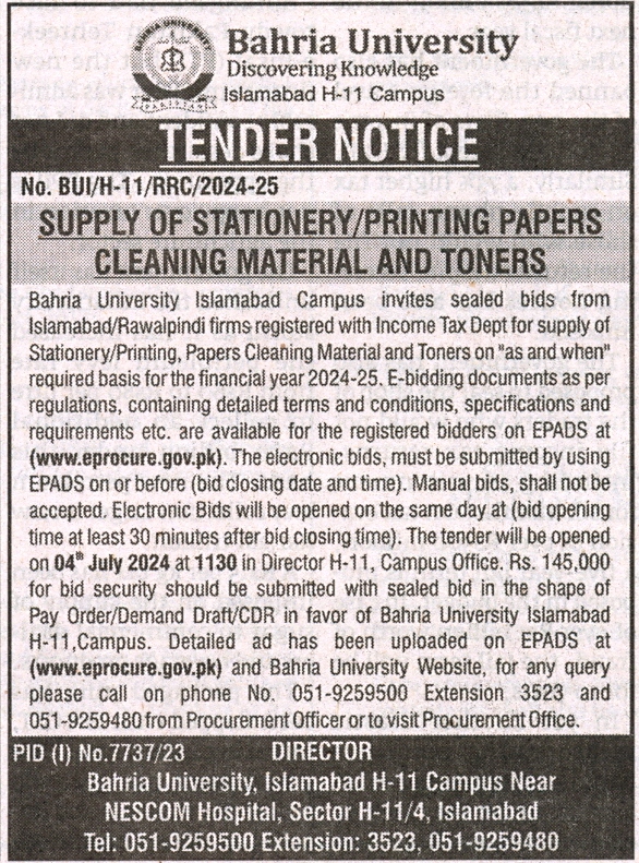 Supply of Stationery/Printing, Papers, Cleaning Material and Toners