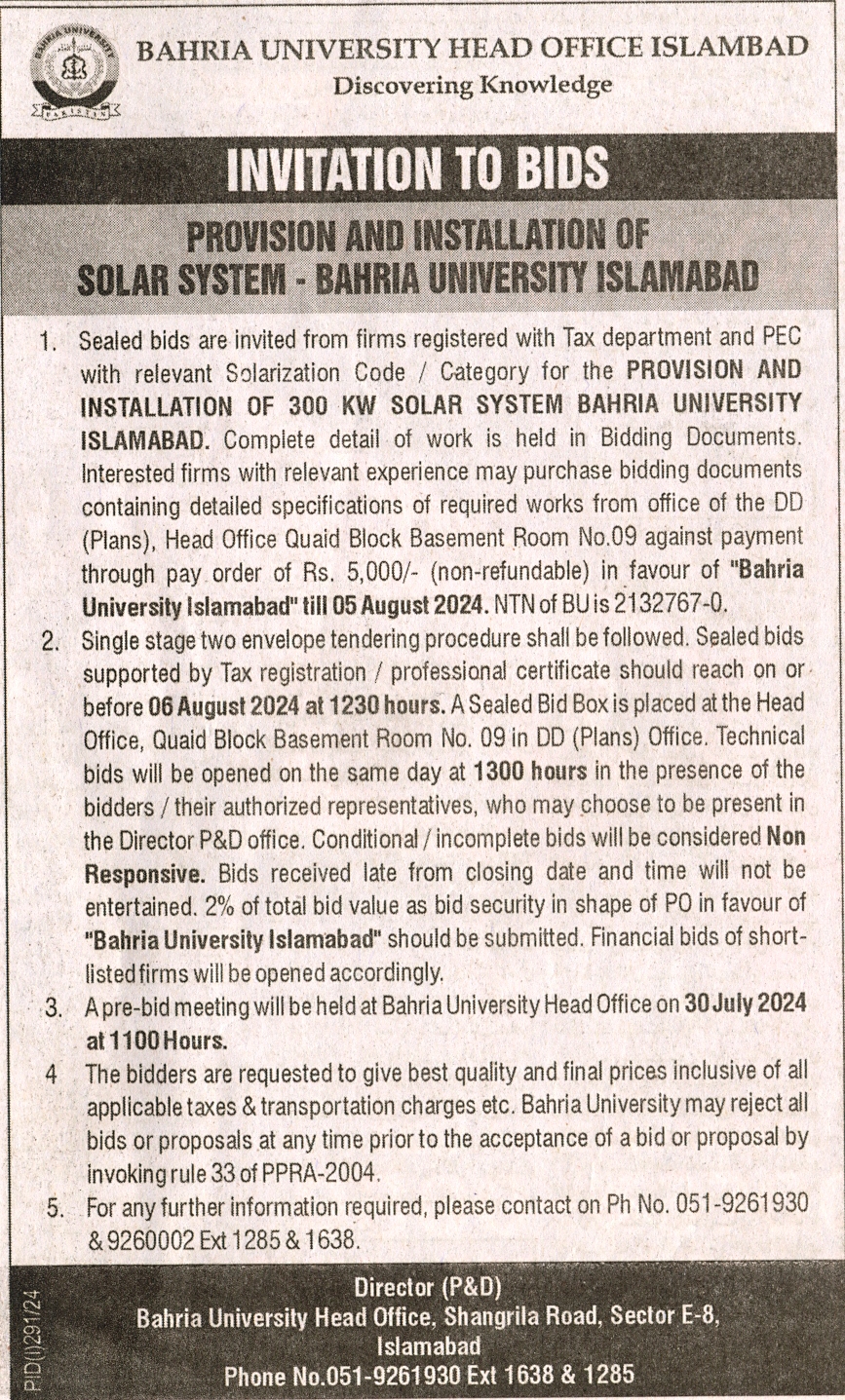 Provision and Installation of Solar System - Bahria University Islamabad
