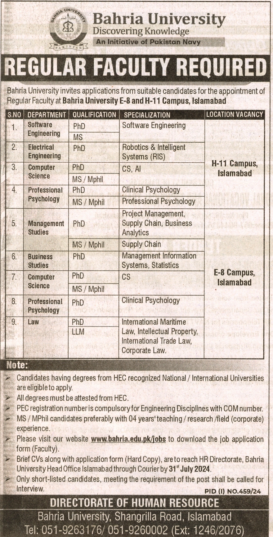 Regular Faculty Required at Bahria University E-8 and H-11 Campus, Islamabad