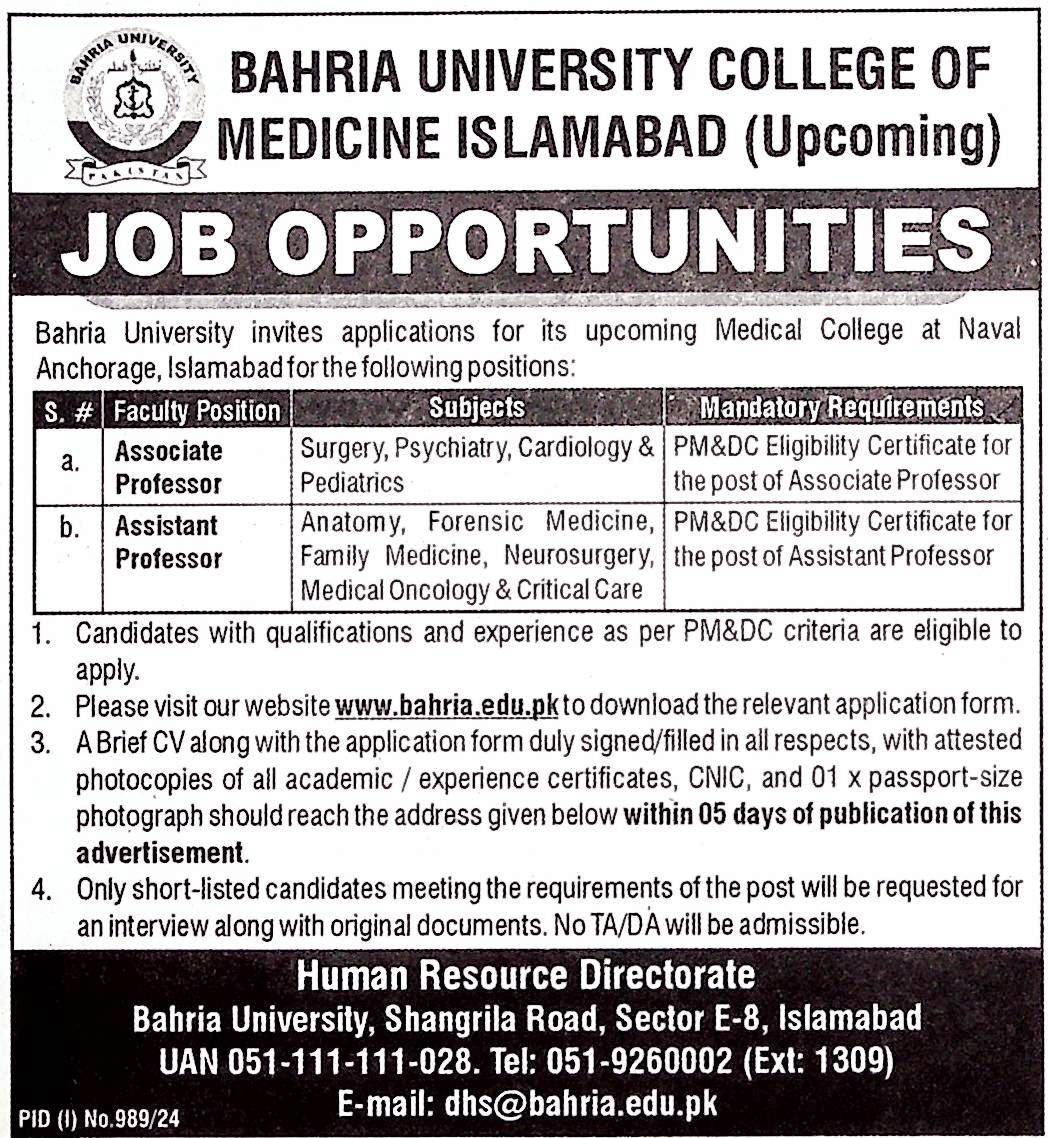 Job Opportunities in Bahria University Collage of Medicine Islamabad