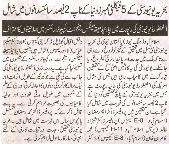 Five Faculty Members of Bahria University are Counted in Top Two Percent of Scientists in the World