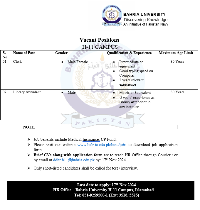 Vacant Positions at Bahria University Engineering School H-11/4 Islamabad Campus