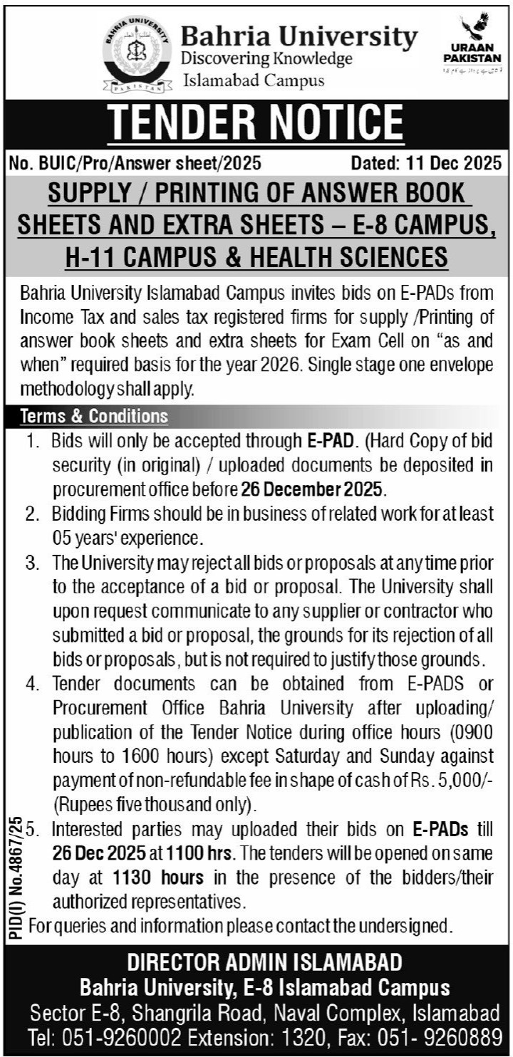 Supply / Printing of Answer Book and Extra Sheet - E8 Campus, H-11 Campus & Health Sciences