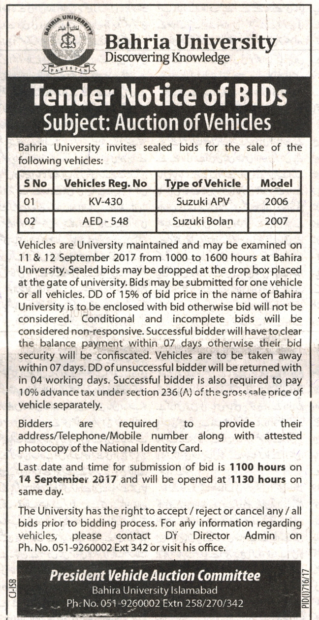 Tender Notice of Bids Auction of Vehicles