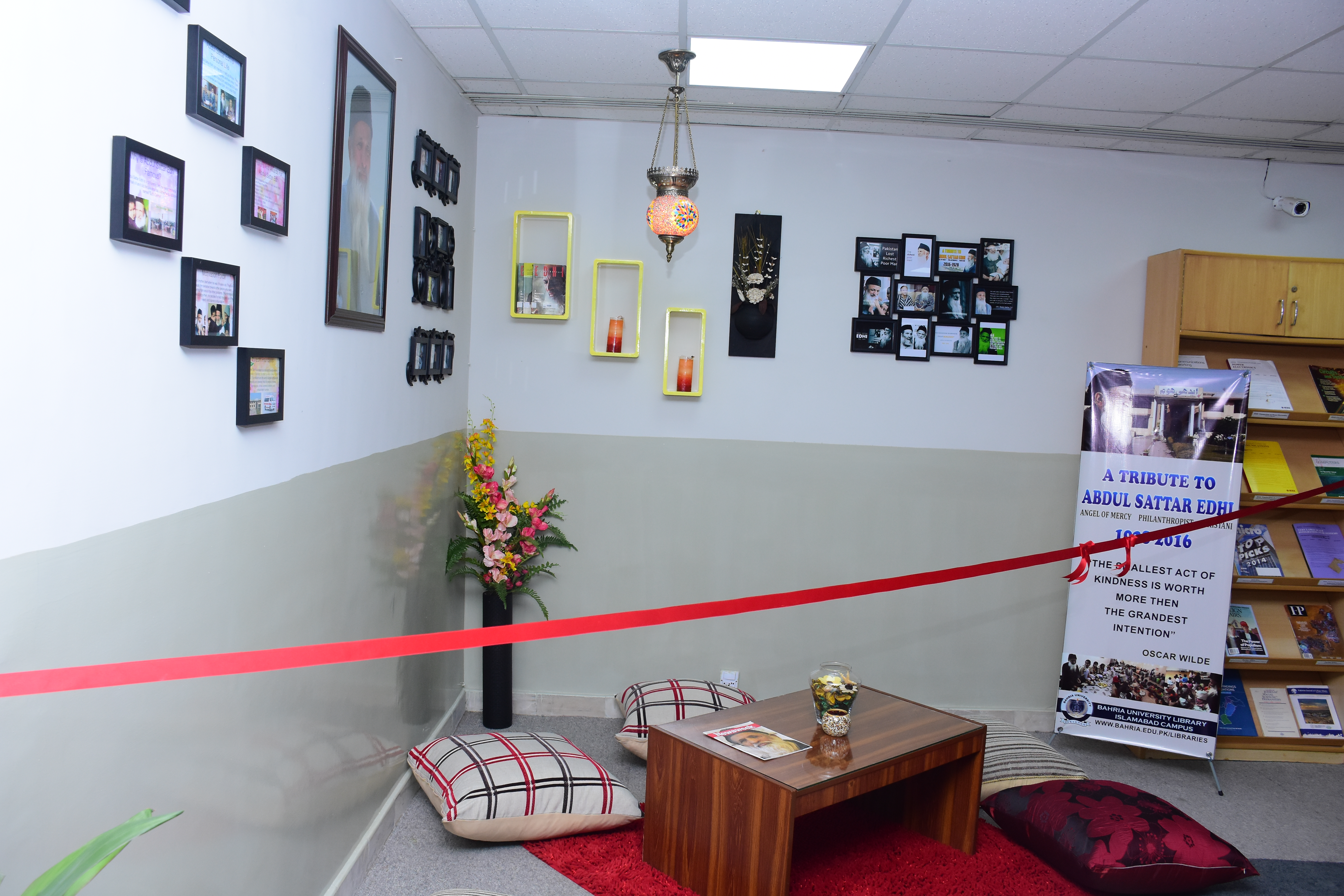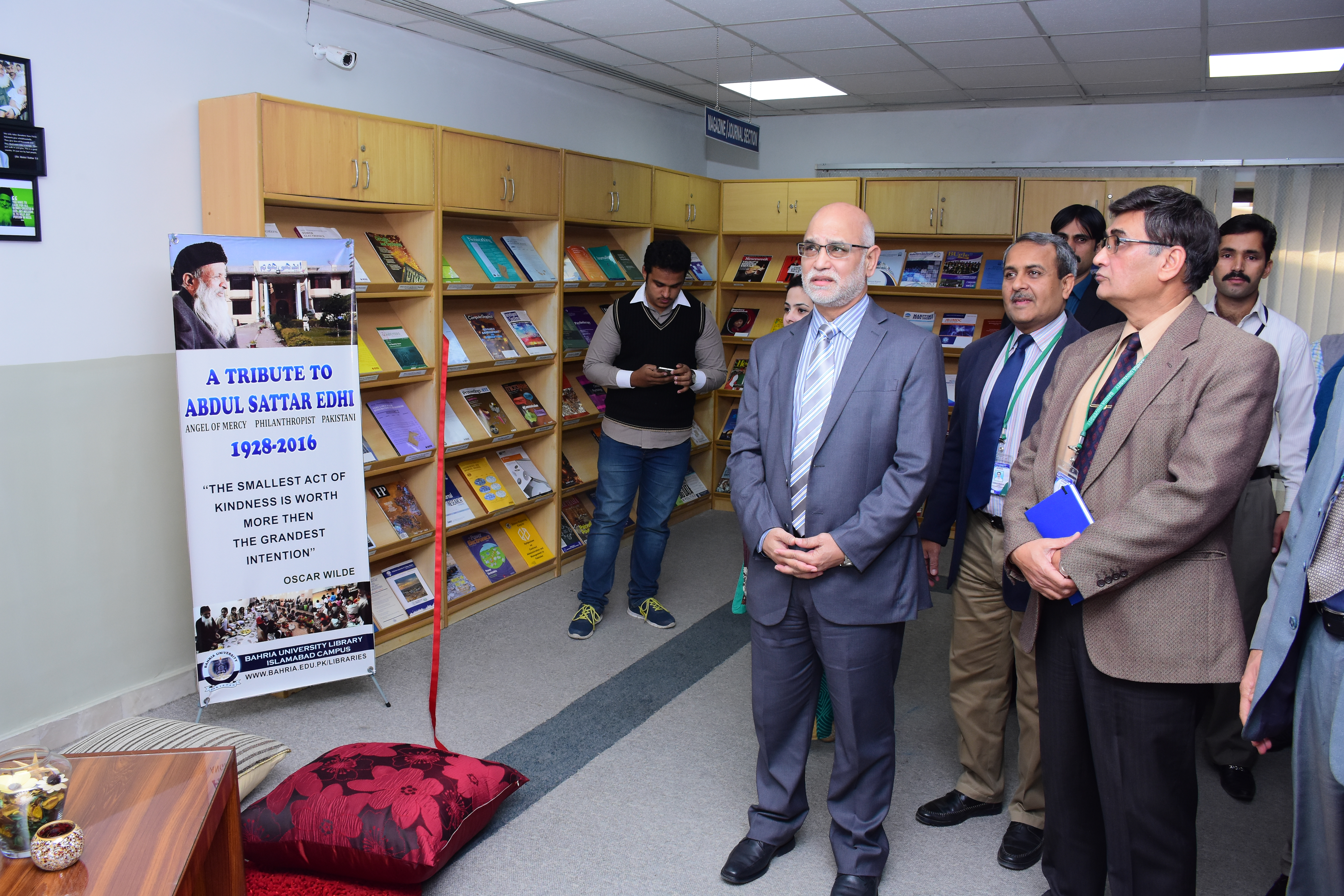 In order to commiserate the legend Abdul Sattar Edhi, an “Abdul Sattar Edhi” corner has been established at Central Library BUIC and is dedicated to pay tribute to his extraordinary services towards humanity. Honorable Pro Rector / DG Campus Rear Admiral (Retd.) Shahid Saeed TI (M) formally inaugurated the Abdul Sattar Edhi Corner. He said in order to promote his extra ordinary humanitarian efforts, we should have annual lectures on the life and humanitarian services and also to conduct Quran Khawani and Prayers on the every death anniversary of Abdul Sattar Edhi. Honorable Pro Rector / DG Campus also appreciated the efforts of library staff being put forward to establish the corner.