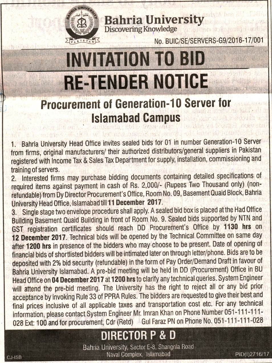 Re-Tender Notice Procurement of Generation-10 Server for Islamabad Campus