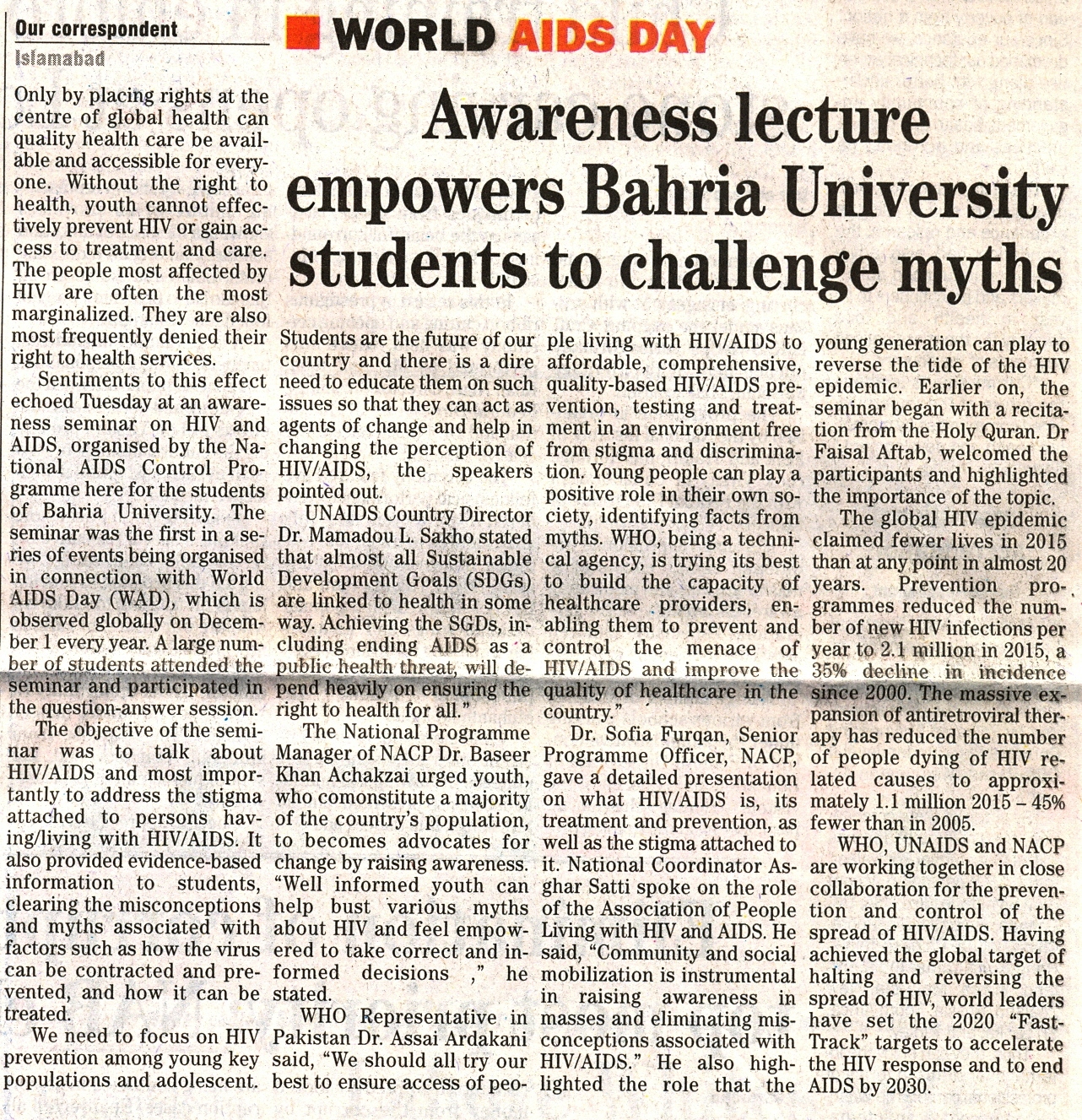 World AIDS day Awareness lecture empowers Bahria University students to challenge myths