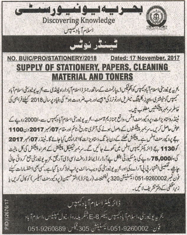 Supply of stationery, papers, cleaning material and toners