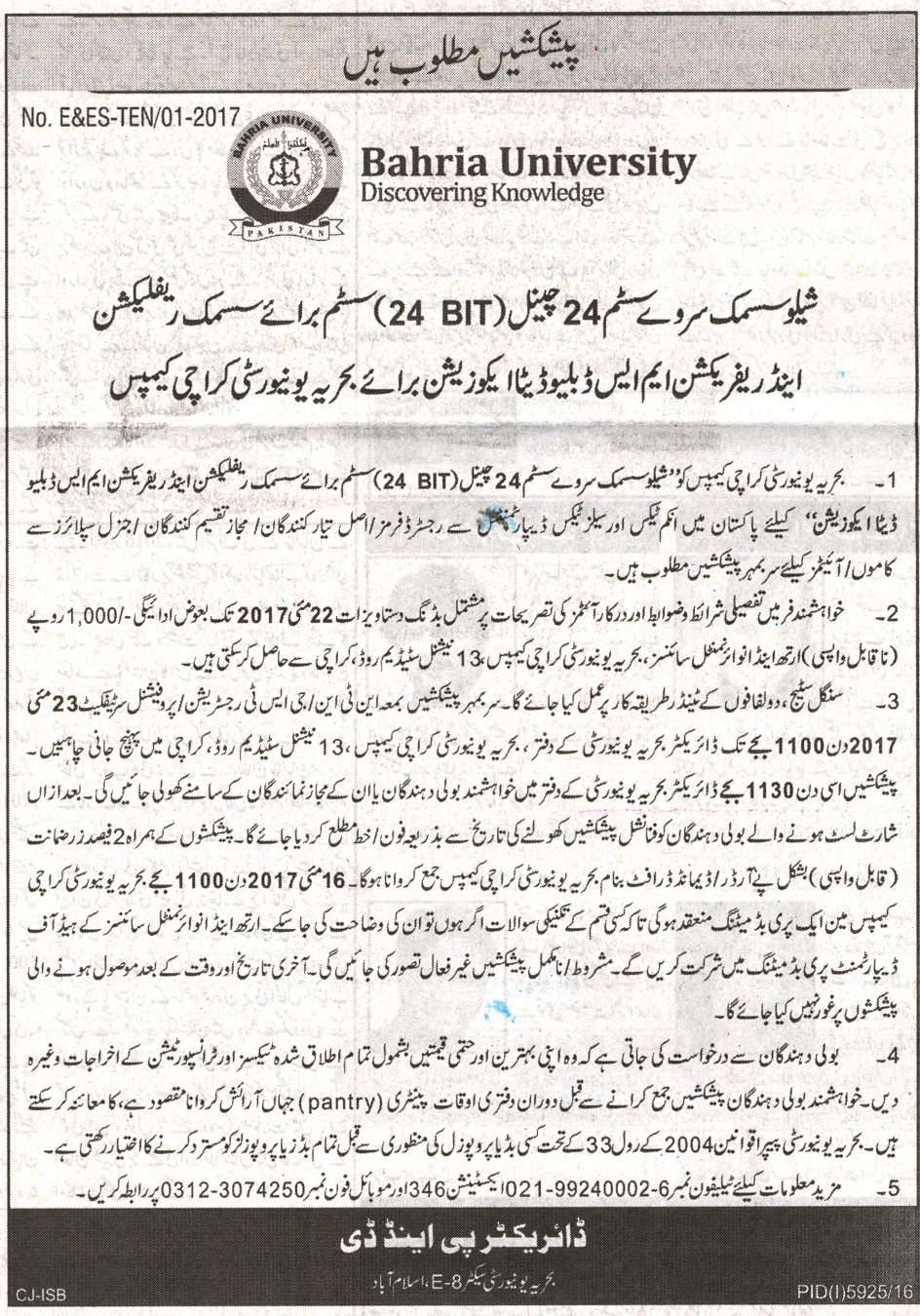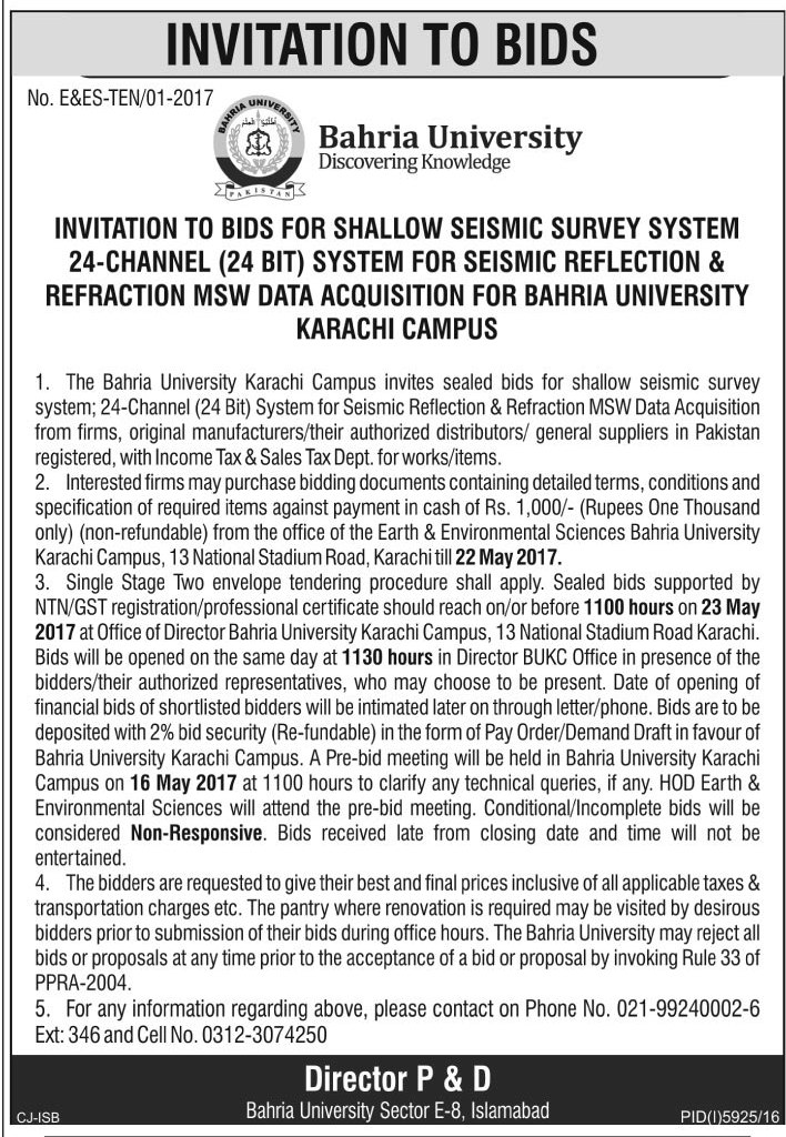 Invitation to bids for shallow seismic survey system 24-channel (24 bit) system for seismic reflection & refraction MSW data acquisition for Bahria University Karachi Campus