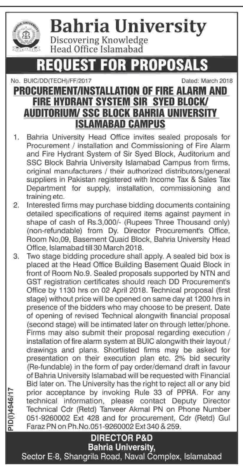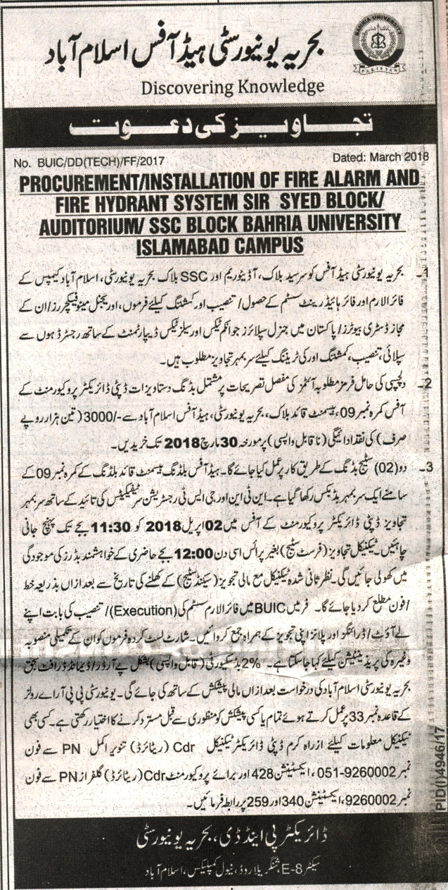 Procurement/Installation of Fire Alarm and Fire Hydrant System Sir Syed Block/Auditorium/SSC Block Bahria University Islamabad Campus