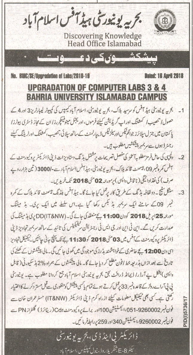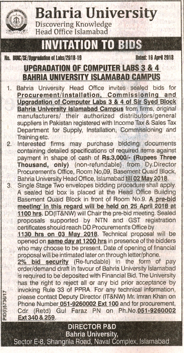 Upgradation of Computer Labs 3 & 4 Bahria University Islamabad Campus
