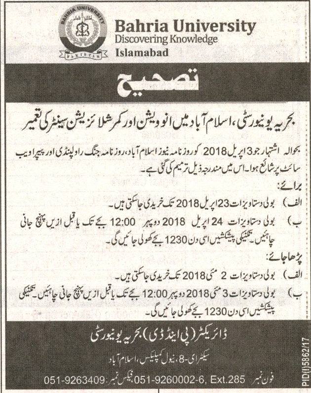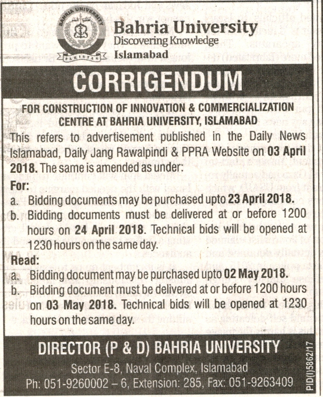 Corrigendum for Construction of Innovation & Commercialization Centre at Bahria University Islamabad