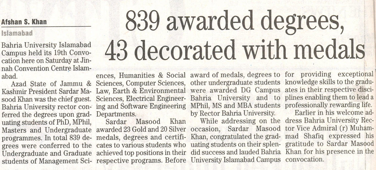 Bahria University Convocation: 839 awarded degrees, 43 decorated with medals