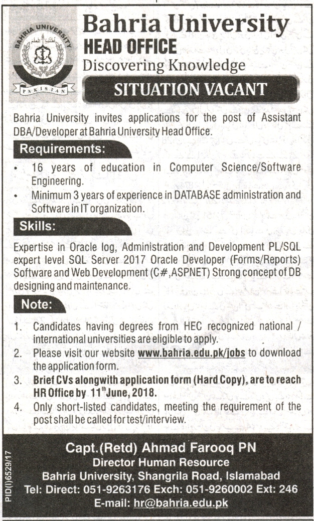 Situation Vacant (Assistant DBA/Developer at Bahria University Head Office)
