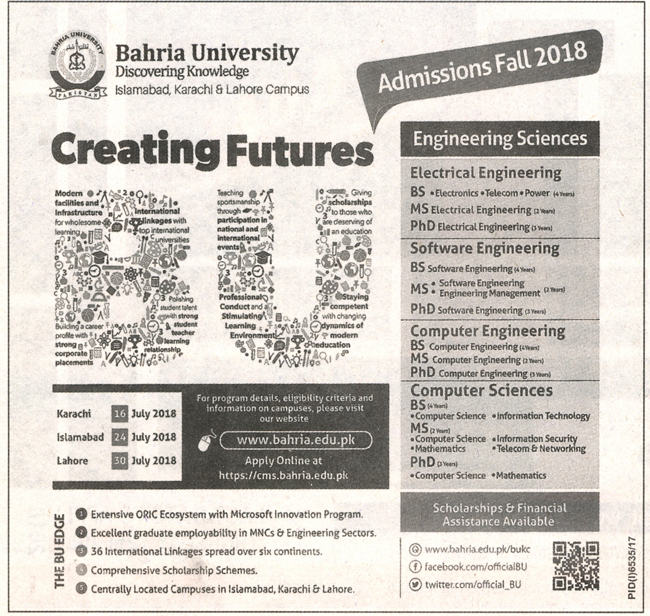 Admission Fall 2018 (Bahria University Islamabad, Karachi and Lahore Campus)
