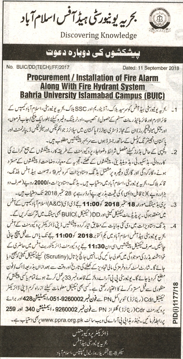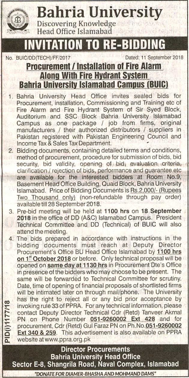 Invitation to Re-Bidding Procurement/Installation of Fire Alarm along with Fire Hydrant System Bahria University Islamabad Campus (BUIC)