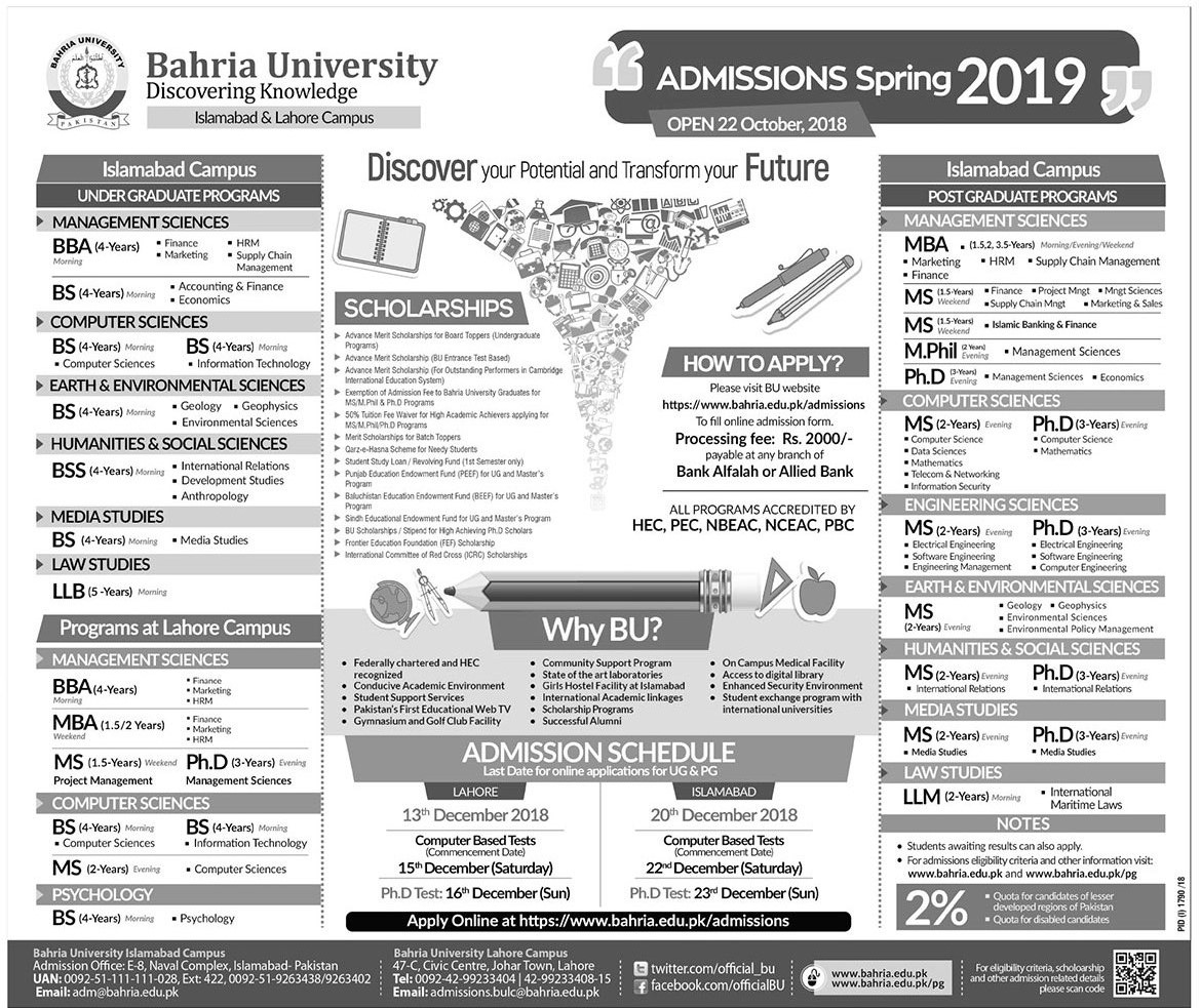 Admission Spring 2019 (Bahria University Islamabad and Lahore Campus)