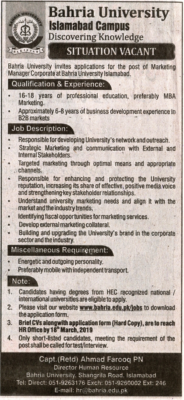Situation Vacant (Marketing Manager Corporate at Bahria University Islamabad)