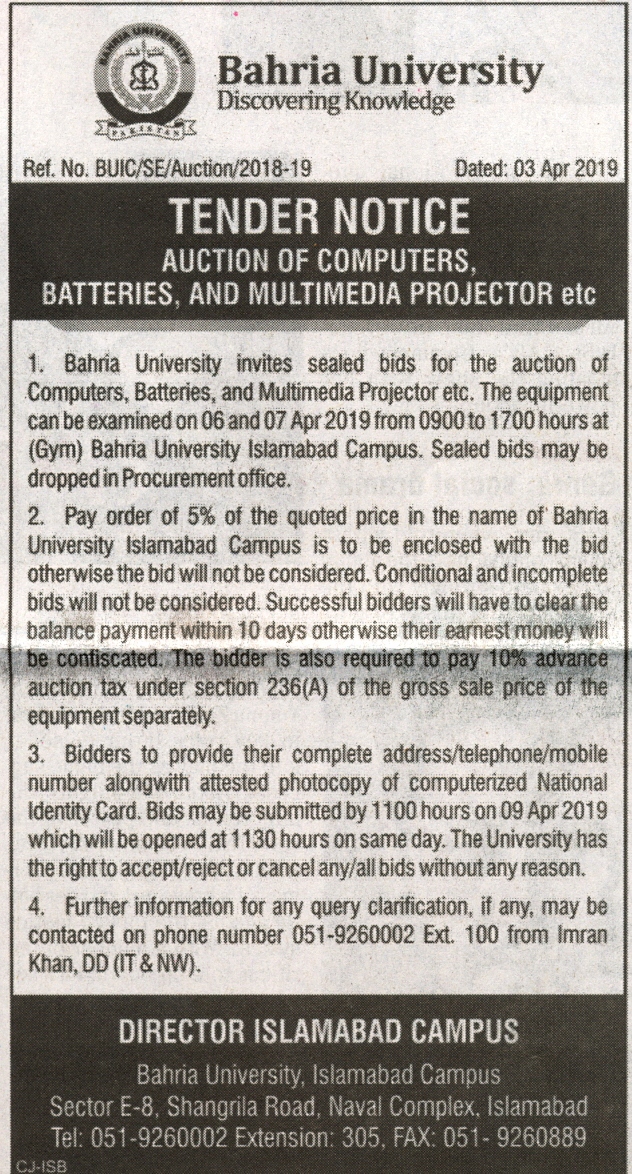 Tender Notice Auction of Computers, Batteries, and Multimedia Projector etc.