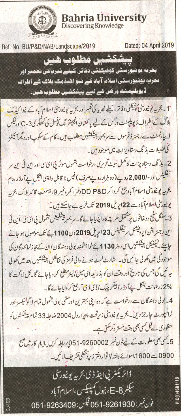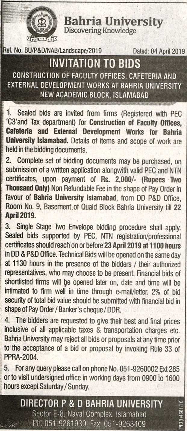 Invitation to Bids Construction of Faculty Offices, Cafeteria and External Development Works at Bahria University New Academic Block