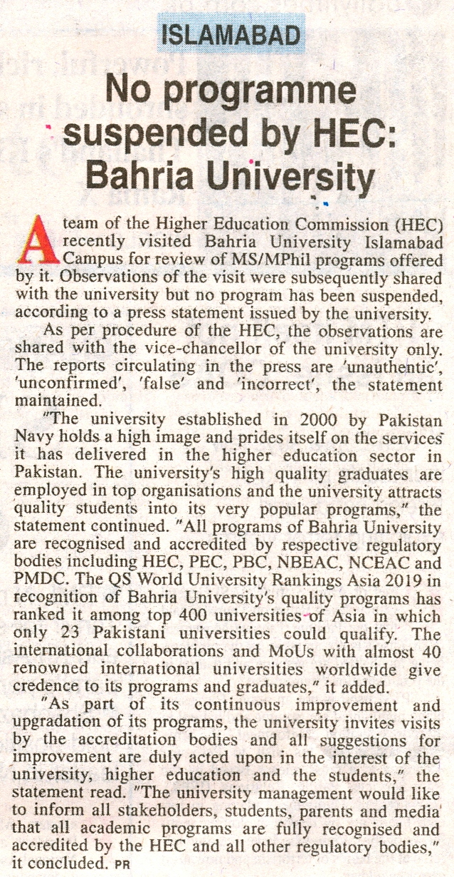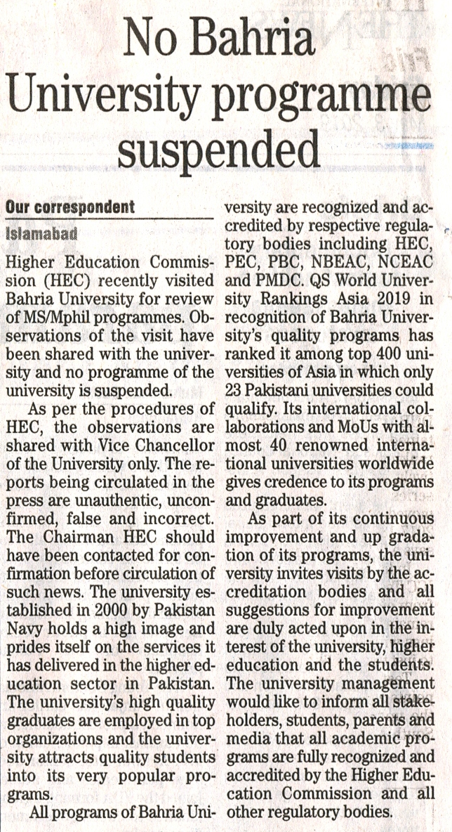 No programme suspended by HEC: Bahria University