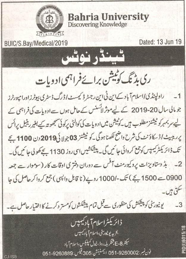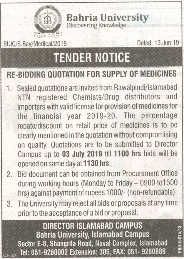 Tender Notice - Re-Bidding Quotation for Supply of Medicines