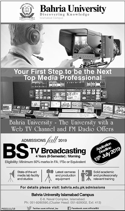 Admission Fall 2019 BS TV Broadcasting (Bahria University Islamabad Campus)